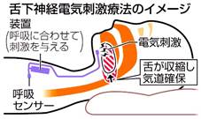 具体的には、鎖骨の下に小型の刺激装置(ペースメーカーに似た機器)を植え込み、呼吸のタイミングに合わせて舌の動きをコントロールする神経に弱い電気刺激を与えます。